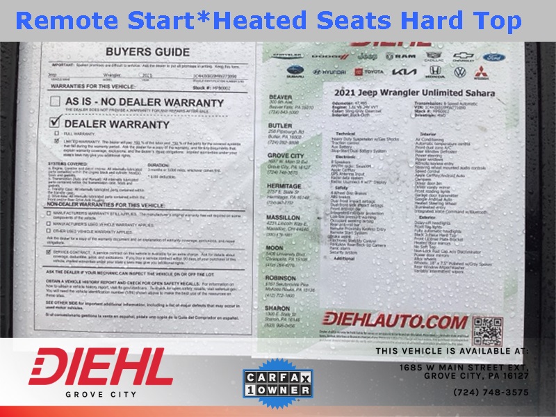 With 47,495 miles, this SUV is ready for more memories and more adventures. This Certified Gold Jeep Wrangler Unlimited Sahara is waiting for you at Diehl of Moon Twp. Schedule your test drive today before someone else claims the fun.